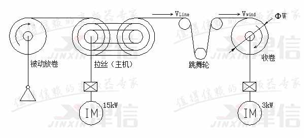 160型水箱拉絲機(jī)放卷為被動(dòng)式放卷,主牽引為15kW交流異步電機(jī),收卷用3kW交流異步電機(jī),設(shè)計(jì)最高線速度為20米/秒。收卷為了與主機(jī)線速度同步并保持恒定張力,引入跳舞輪緩沖機(jī)構(gòu)。由于跳舞輪上未安裝伺服氣缸,因此在正常運(yùn)行過(guò)程中鋼絲的張力只與跳舞輪及其上配重塊的重量有關(guān),而與跳舞輪的位置無(wú)關(guān)。