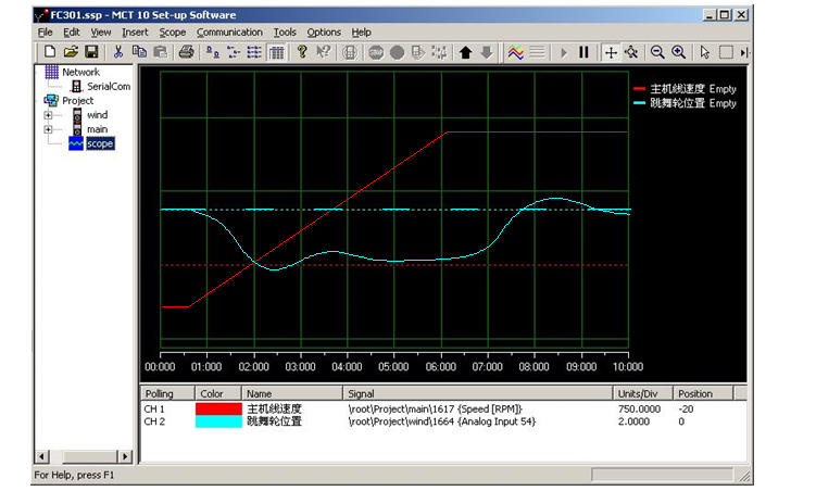 卷繞控制的特點(diǎn):同樣的一套PID調(diào)節(jié)參數(shù),勻速時(shí)易于穩(wěn)定,波動(dòng)也較?。欢铀贂r(shí)就不易于穩(wěn)定,而且因?yàn)樘栎單恢糜徐o差,波動(dòng)幅度也較大。因此PID調(diào)節(jié)參數(shù)主要針對(duì)加減速過(guò)程予以優(yōu)化。MCT軟件有數(shù)字示波器功能,通過(guò)實(shí)時(shí)觀測(cè)線速度和跳舞輪位置在加減速時(shí)的變化曲線,能很方便地調(diào)整調(diào)節(jié)參數(shù)。